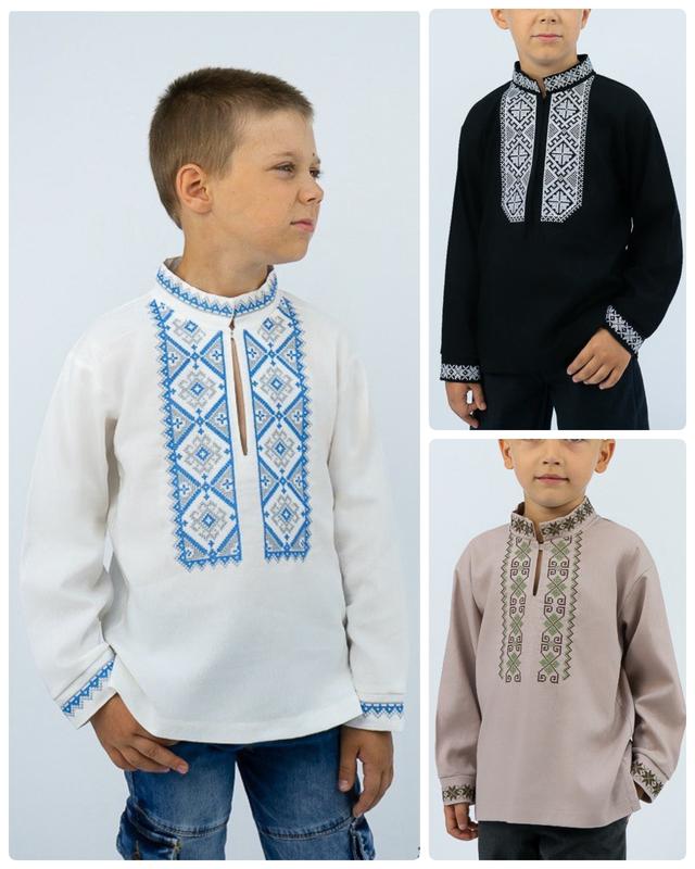 Вишиванка для хлопчиків виконана з полегшеного матеріалу, основою якого є льон. Це тонка і легка тканина з чудовим зовнішнім виглядом. Прекрасно тримає форму, не мнеться, має хорошу гігроскопічність. Модель прямого крою з довгим рукавом під манжет на кнопці, з коміром – стійкою. Передня частина виробу, а також комір і манжети прикрашені машинною вишивкою.