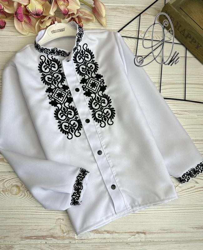 Вишиванка на хлопчика "Біла/Чорний орнамент на кнопках" Опис ✅Арт: 94459 Вир-во: Україна ✅Тка-на: Сорочковий Габардин ✅Додатково: машинна вишивка. ✅ЗВЕРТАЄМО УВАГУ НА ЗАМІРИ! ✅Заміри: довжина/ширина/рукав від плеча. 116-47/37/44 122-50/39/46 128-52/42/49 134-55/43/51 140-57/45/54 146-60/47/56 152- 62/48/59 158- 64/50/60 164- 66/51/61 ✅Можлива похибка у вимірах +- 1/2 см