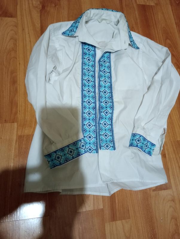 Красивая вышиванка, вышитая вручную, густым мелким крестом. Яркие цвета, в очень хорошем состоянии. Застегивается на пуговицы, перчатки также. Для высокого мальчика будет на 5-7 лет, для низкого - до 8. Замеры: рукав 40, длина 52, ширина 41