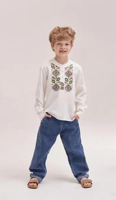 Нова вишиванка для хлопчика Merezhka. Розмір 134,орієнтовно 8-9 років. Вишиванка має бути вільна (див. заміри). Тканина 45% льон, 55% бавовна. Вишивка машинна, хрестиком. Довжина від плеча 52,довжина від пахви 33, ширина 41,рукав від плеча 50,рукав від пахви 38,ширина в плечах 34 (можлива невелика похибка в замірах).