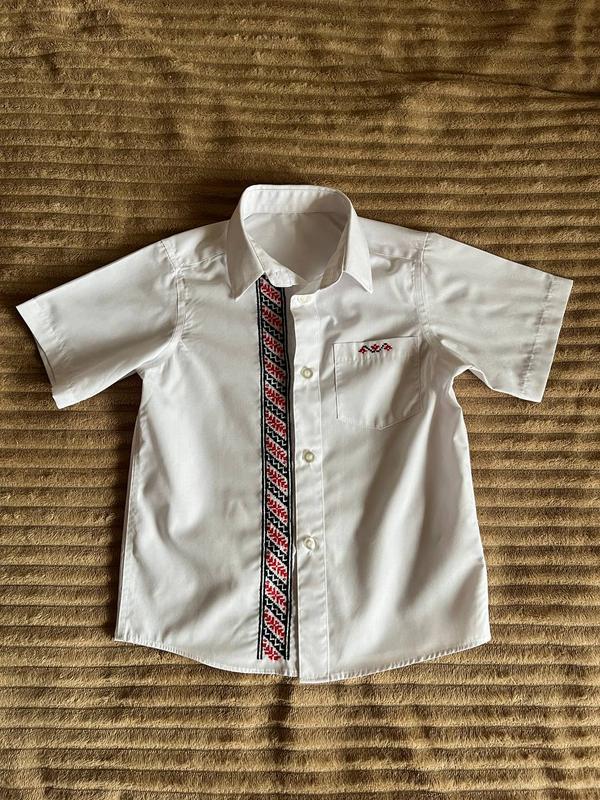 Вышиванка детская для мальчика, с коротким рукавом. Минималистичная, стильная. Дети разные, и лучше ориентироваться на конкретные замеры: • Длина: 44-46 см • Ширина спинки (от шва до шва рукавов): 27 см