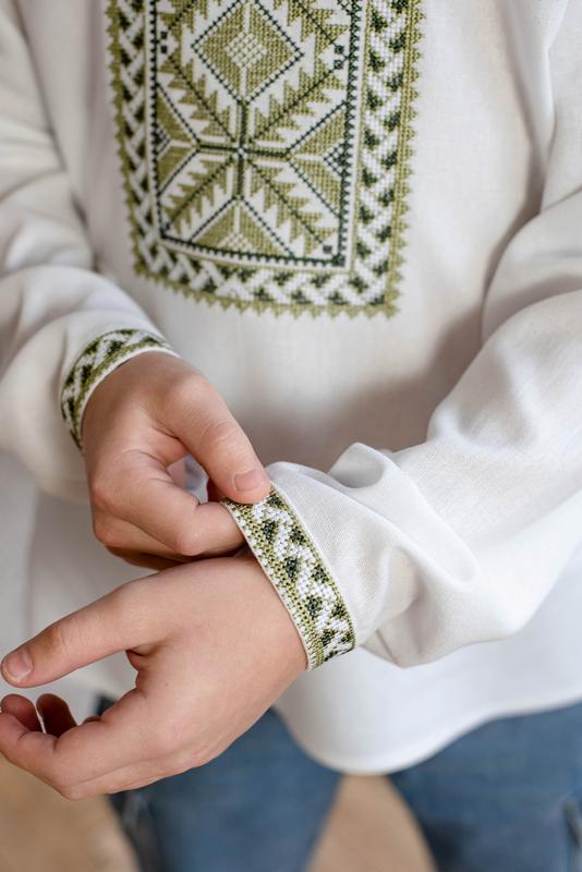 От 146 +150 грн от 158 +200 грн Детская вышиванка из домотканого полотна – это стильное сочетание традиций и комфорта. Выполнена из натуральной ткани, она обеспечивает приятные ощущения на коже и комфорт в носке. Украшена вышивкой в нежных зеленых оттенках, символизирующей гармонию и естественную красоту. Орнамент расположен на груди, манжетах и воротничке, добавляя изделию изысканности. Благодаря классическому фасону эта рубашка подходит как для торжественных событий, так и для повседневной носки. Тканина бавовна 100% Тип вышивки хрестик