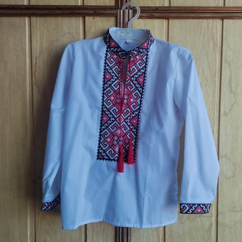 Біла вишиванка з червоними китицями на хлопчика , довжина рукавів 41 см, у плечах 30 см, довжина самої сорочки 48-50 см, дефектів немає, не носилась жодного разу.
