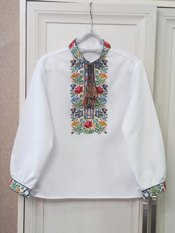 Вишита хрестиком кольоровими нитками на білому оніксі. Заміри: Окружність шиї - 32см Окружність грудей - 73см Плечі - 32см Довжина рукава - 40см Довжина сорочки - 47см В ціну не входить % на шафі. На замовлення виконаю у іншому розмірі