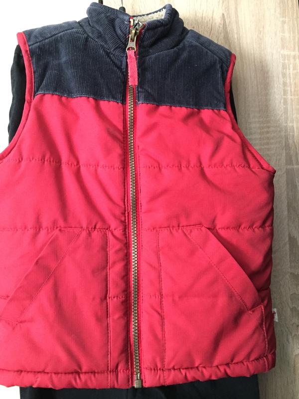 Утепленная жилетка заказана с официального сайта.Тепленькая, смотрится очень стильно. Цвет красный, вставки из вельвета черного цвета, внутри подкладочная ткань. Состав: жилет снаружи: 100% полиэстер с вельветовыми вставками; жилет внутри: 100% полиэстер флис; воротник: 100% искусственная овчина.