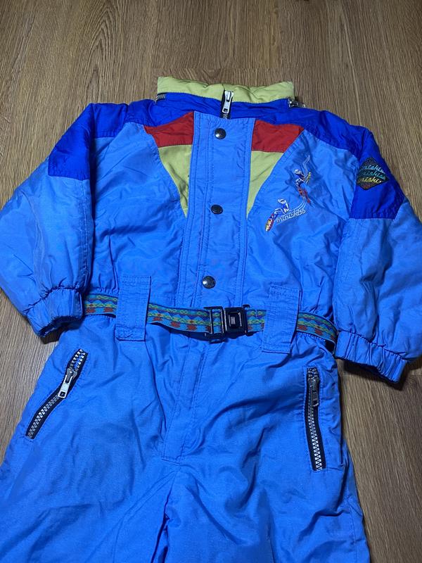 Дитячий зимовий/лижний комбінезон, на зріст - 102 см Фіксуючі резинки на ногах, та руках. Резинка на талії + пояс. Захисна тканина для змійки. Прихований капюшон. Є зовні, спереду дві кишені на змійці. Талія - 28 см (напівобхват, тягнеться), Стегна - 36 см (напівобхват). З верху до низу - 91 см, Від талії до низу - 57 см + 3 см резинка, Від паху до низу - 39 см, Від талії до паху - 20 см + 3 см резинка, Зверху до паху - 48 см + 5 см горловина.