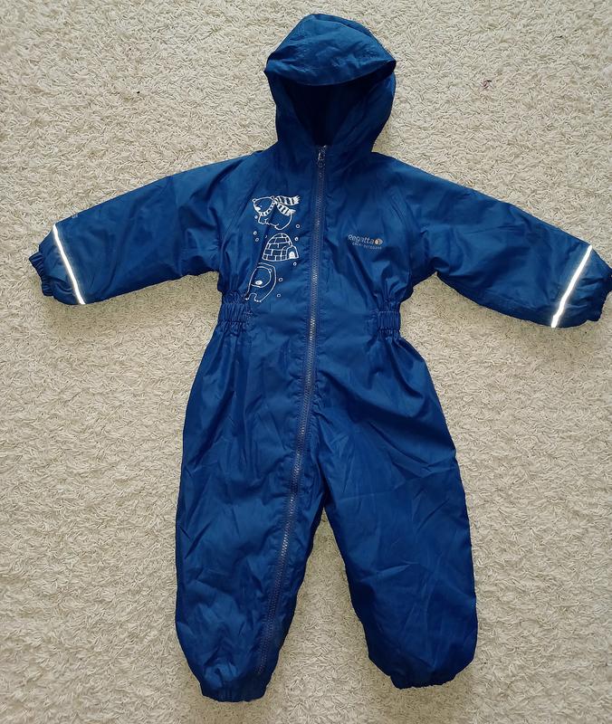 В ідеальному стані, як новий. Дуже подобається що на руках, ногах і на талії резинка від задування. Спинка має флісову підкладку. Верхня тканина цупка, не тоненька. Довжина - 76см, довжина по спинці до талії- 25см. крок- 33см. рукав 39см, ПОГ- 34см