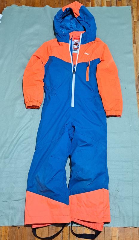 зимовий дитячий комбінезон (для хлопців та дівчат) синього кольору з вставками яскраво-оранджевого кольору, утеплений флюсом та синтепоном, в поясі є резинка, на ріст 110-114, стан новий