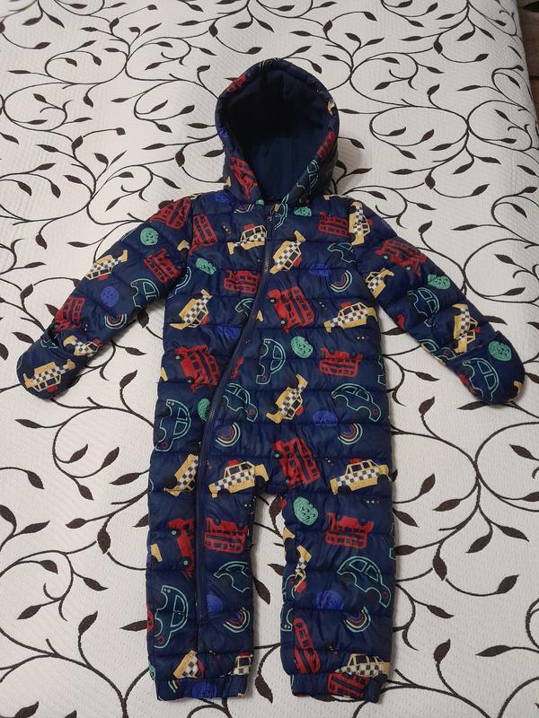 Комбінезон демісезонний на хлопчика 1,5-2 роки, фірми F&F. На синтепоні та до середини на флісі. Рукавчик закривається рукавичкою. Заміри: довжина від плеча до низу 73 см, від плеча до паху 51 см, напівобхват грудей 32 см, довжина рукава від плеча 32 см, з рукавичкою 38 см.