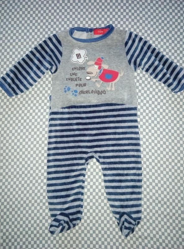 Велюровий чоловічок в стані нового, розмір вказано 6М. Склад - 75% бавовна, 25% поліестер. Заміри:Довжина рукава 23 см, плечі 21 см, ширина по грудях 26см, довжина від плеча до межног 41 см, довжина від плеча по боковому шву і до п'ят 57 див.
