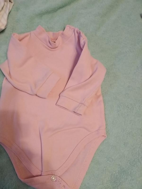 Рожевий боді під горлечко.Є невеликі цятки.На 2 фото показано.