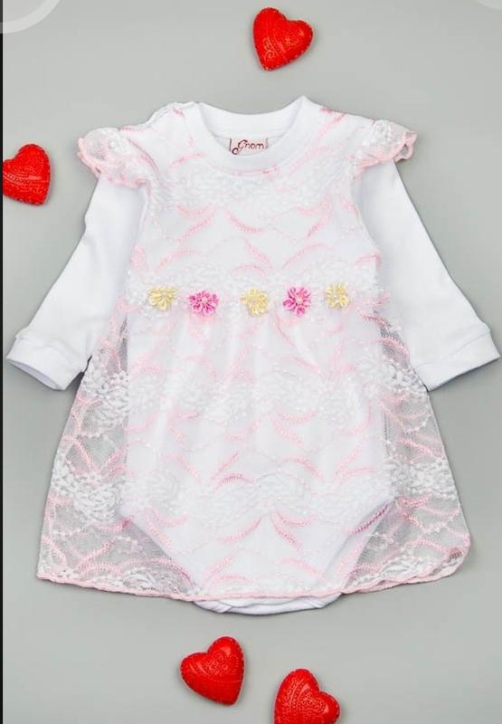 Шикарний бодік виготовлений з интерлока,а саме платтячко з трикотажного гіпюру.За какетке виріб прикрашений квіточками.На плечі мережа застібки-кнопки.