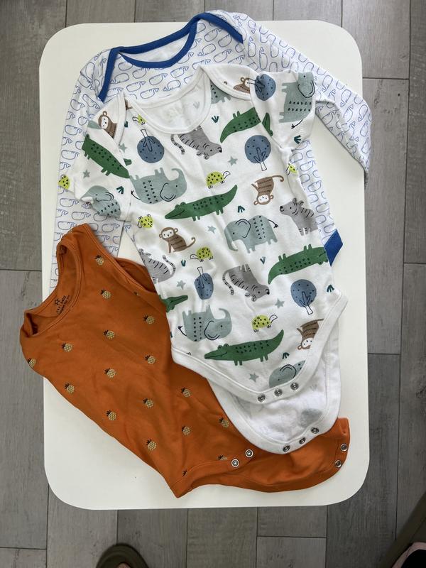 Состояние бодиков идеальное. Длинный рукав новый, футболка и Майка идеальное состояние. Длинный рукав и Майка 12-18, с зверюшками 18-24
