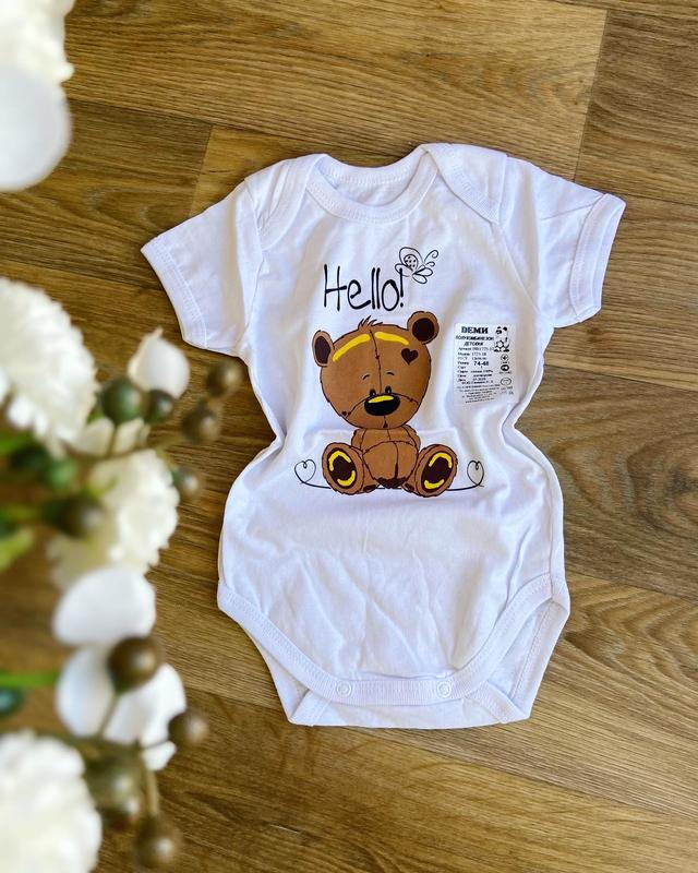 Оригинальное и очень нежное боди для новорожденных не оставит никого равнодушным и подарит Вам и Вашей крохе отличное настроение! Такой бодик станет отличным вариантом для семейного отдыха, летней прогулки или просто для дома. Модель однотонная, украшена милым детским рисунком медвежонка. Застегивается на закрытые кнопочки между ножек, что намного упрощает процесс переодевания. Полотно изделия - натуральный и гиппоаллергенный кулир отличного качества, что обязательно порадует заботливую маму. Размеры: Рост 68см (3-6мес):Длина-37см,Ширина-22см Рост 74см (6-9мес):Длина-40см,Ширина-24см