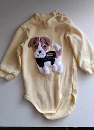 Боді-гольф з песиком Патроном для немовлят жовтий зі стійкою та манжетами на рукавах. Така модель боді дуже зручна для малюків, коли потрібно закрити шийку. Тканина рібана має добру розтяжку, крім того біля горловини є збоку застібка. Для кого: хлопчику;можна й дівчинці. Колір: жовтий Тканина: рібана; тягуча,така як легка байка. Дуже приємна до тіла. Немає нажаль бірки. Буде десь 0-3 або 4 місяців.залежно від дитини. Можу скину заміри. Стан новий. Можете подивитись в інтернеті описи. Ціна там теж більше. Віддаю так аби не стояло вдома.