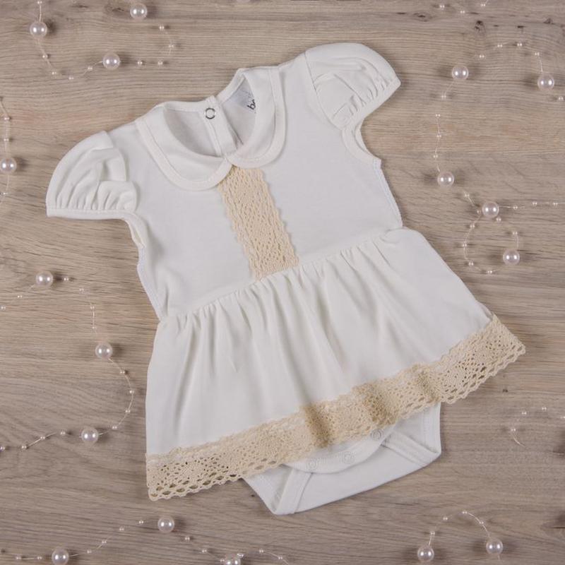 Боди с воротничком, рукавами-фонариками и юбочкой украшено натуральным кружевом. Идеальный вариант одежды для праздничных и повседневных дней. Изделие удобно застегивается кнопочками на спинке и между ножек. Наряд представлен в белом и молочном цветах. Изготавливается из натурального интерлока - нежный, приятный на ощупь и гипоаллергенный материал. Рекомендации по уходу: - ручная или машинная стирка в деликатном режиме при температуре не выше 40°С; - легкий отжим; - не отбеливать. Размер: на рост 56 см
