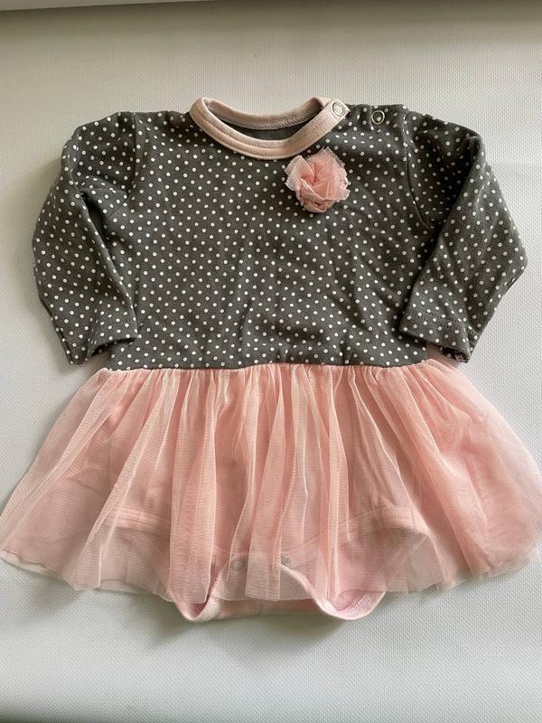 Бодік з фатиновою спідничкою у відмінному стані на дитину 0-3 місяці. Довжина виробу по спинці від плеча 36 см, ПГ 23 см, довжина рукава 20 см. Тканина тягнеться. Дешевше та більше товару на kupi-slona*pp*ua Модель 3911