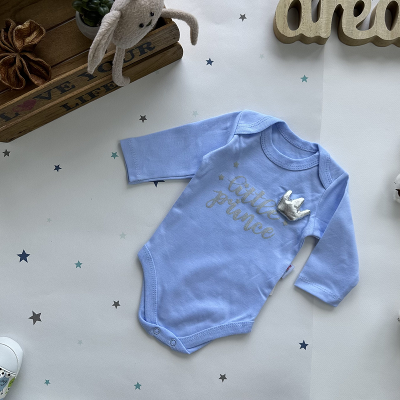 Боді для маленького принца виробництва Туреччина. Знизу застібається на кнопки. Трикотаж інтерлок, бавовна. Ніжний та приємний на дотик. Розміри: 62 см- рукав 19 довжина 34 (від плеча кнопок) 86 см- 27/48
