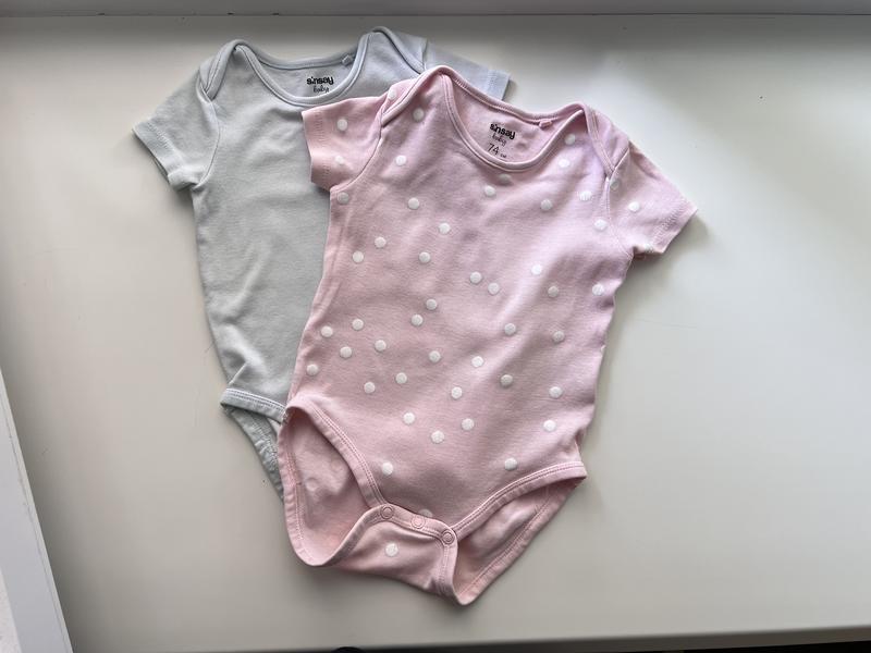 сет Боді з коротким рукавом Sinsay 74 см за біркою. Моя носила на 68 см. Блакитний з плямою. Зʼявилася, поки лежала в пакеті. Можливо можна випрати. Рожева в доброму стані. Після однієї дитини.