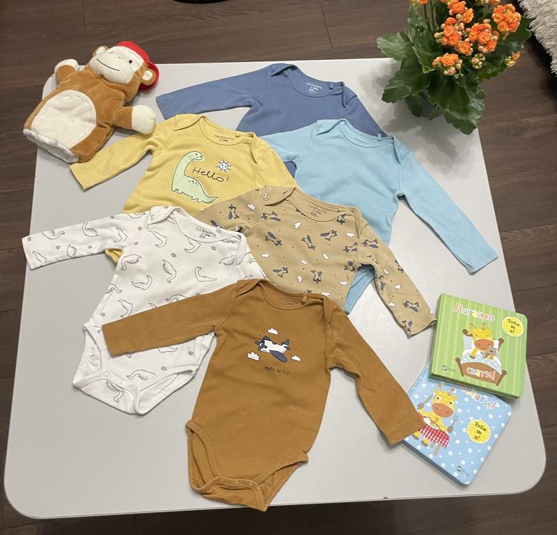 9 різних бодіків на розмір 68 см або 3-6 місяців. Тканина - бавовна.