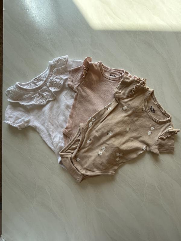 Комплект з 3шт боді для дівчинки Біле боді з комірцем із прошви Рожеве боді в рубчик з крильцями Бежеве боді в білі квіточки з крильцями Тканина: кулір, рубчик, трикотаж Одягнуті по 1 разу