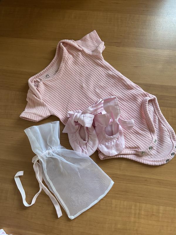Боді пудровий 62/68 б/в( зручно одягати, гарно тягнеться) та пінетки святкові нові