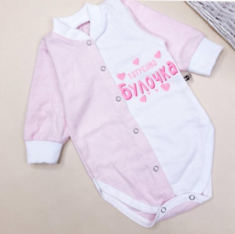 Ніжне дитяче боді з милим написом "Татусина булочка" та рожевими сердечками. Особливості: Матеріал: м'яка преміум байка Розмір: 0-3 місяці Колір: рожево-білий Бренд: Eldoll Стан: ідеальний Зручні кнопки для легкого одягання та зміни підгузка. Контрастні білі манжети та комір. Ідеально підходить для новонароджених дівчаток або як подарунок молодим батькам.