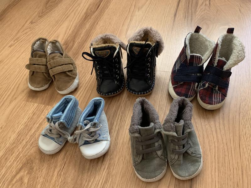 Біло-голубі ідуть на 3 міс. Інші 6-9 місяців утеплені, чобітками - зимові. Зверху хутро відійшло від картонки (так було спочатку, показала на фото), але, звичайно, ні на що не впливає. Ціна за одні