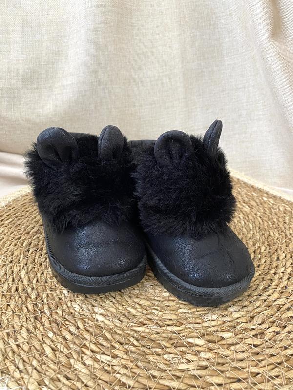 Милі угги з вушками для дівчинки. Колір насичено чорний з блискітками. Стан дуже гарний, є незначні подряпини на передках, та підошві. Не протікаю, дуже теплі. Устілка 14см, ширина стопи 7см.