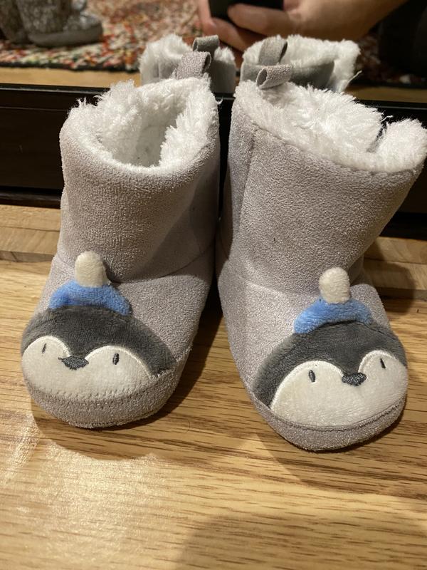 Очень удобные и милые, на липучке тепленькие на ножку 12 см. В хорошем состоянии. Трещи следует подчистить. По земле нежная дорога. Може де спирались ніжками.