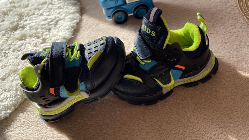 Пара детских ботинок темно-синего цвета с ярко-зелеными и оранжевыми элементами🤗Ботинки имеют светоотражающие детали и липучки для фиксации🤗 Размер 21 Замеры способны сбросить
