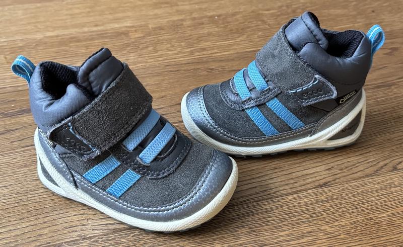 Оригінальні демісезонні черевички Ecco biom розмір 20, устілка вовна 13см. Модель на широкій, міцній липучці. Підкладка текстиль. Верх комбінований - замша, плащівка. Мембрана Gore- Tex, не промокають. В чудовому стані!
