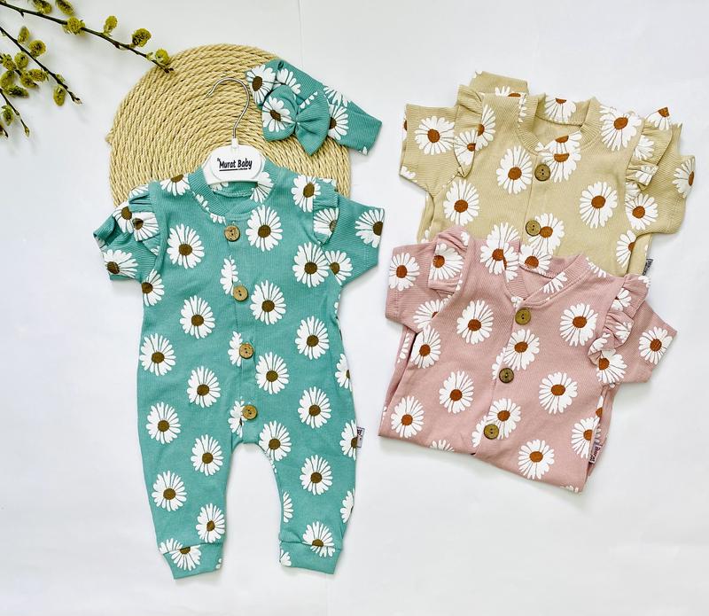 Ромпер для дівчаток з коротким рукавом, принт у ромашки, тканина рубчик,100% бавовна. Розмір: 3-6-9-12 місяців Колір: бежевий, рожевий, зелений Виробник Туреччина Розмір і колір уточнюйте!!!