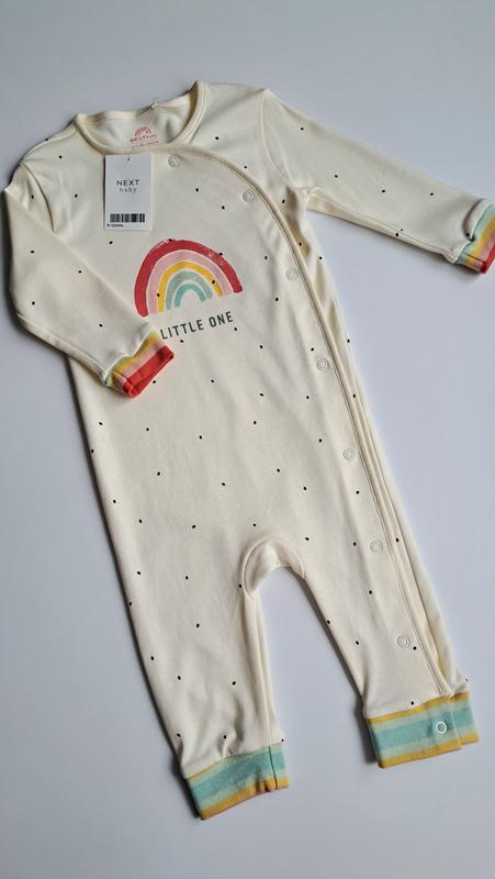 Ромпер Next з принтом веселки і написом "Little one" підійде і хлопчикам, і дівчаткам. Застібки кнопочки розміщені збоку по всій довжині виробу, ніжки відкриті, є кольорові манжети і на ручках, і на ніжках. 100% бавовна. Розмір 80 (9-12 міс).
