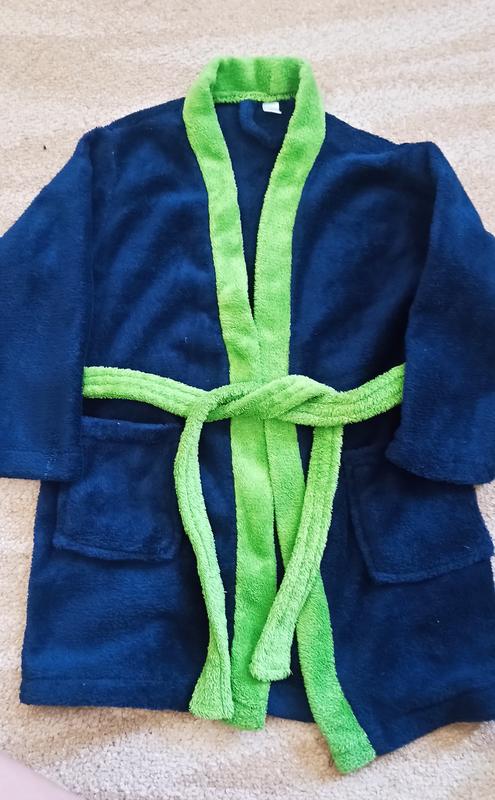 Тепленький халатик для хлопчика в чудовому стані насичено синього кольору, поясок пришитий , дві кишені,лише на одному рукаві є білий слід - незнаю від чого