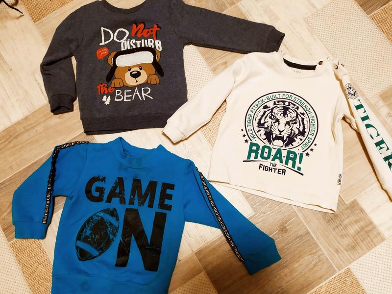 три реглана на рост 92см длина 35см плечи 24 грудь 29 рукав 28 состояние на синем пару бледных пятнышек думаю при стирке отойдут .остальное отлично цена за 1штуку при покупке 3шт цена 147гр на выбор по 80гр почта укр и новая