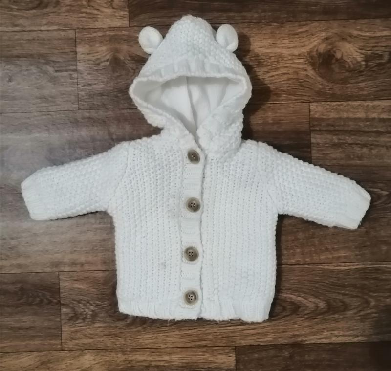 Тепла кофта дитяча в нормальному стані , зручний капюшон з вушками застібка на гудзиках, дефект видно на фото Розмір 110-116 (довжина 35,рукав 35, обхват грудей 60=