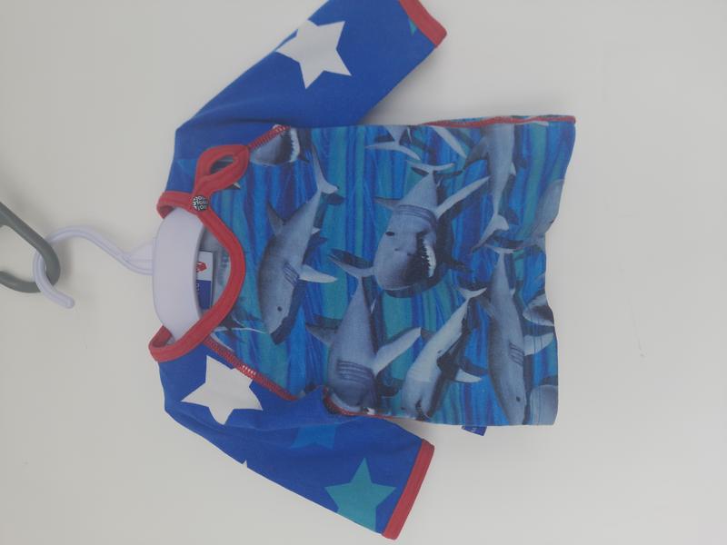 Гарний трикотажна кофтина з принтом акул. На плечику 2 кнопки для зручності. Стан дуже гарний.