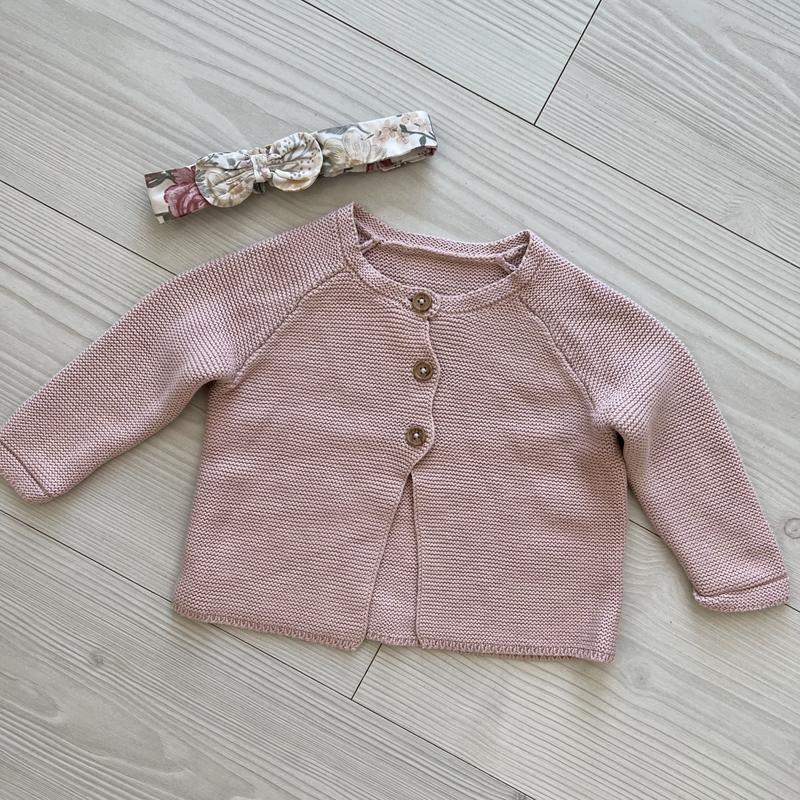 Состояние новых вещей. Кардиган надели пару раз, размер 3-6 мес. Повязки одевали только для фото.