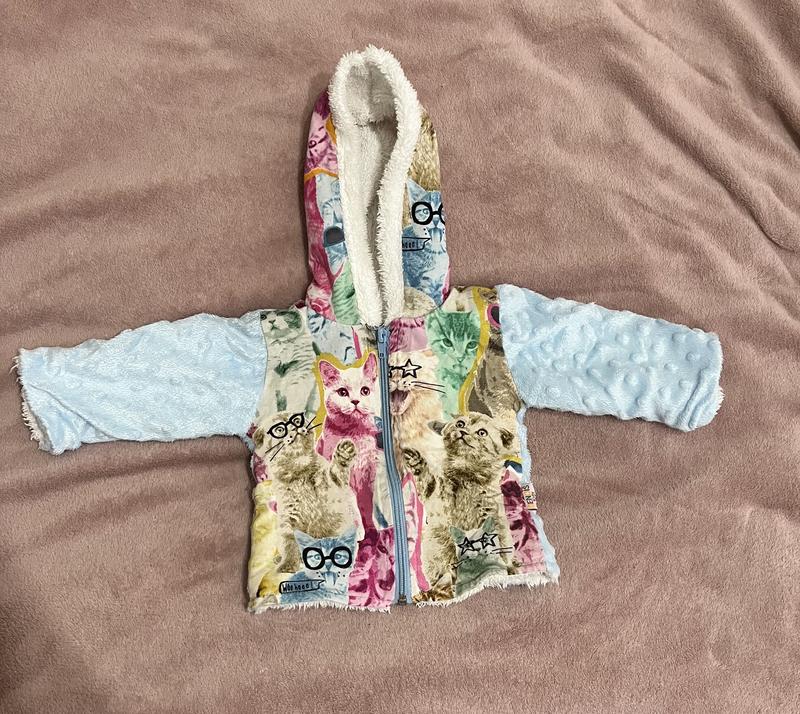 Розмір не вказаний,але думаю десь 74 (від 6-9 місяців).Кофта тепленька,ззаді без малюнка,однотонна