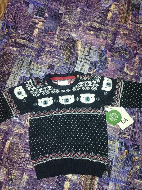 Жаккардовий светрик на малюка, не тонкий, на плечі гудзики, низ та рукава на манжетах. Викуплений з офіційного сайту, в магазинах не висів. Склад 100% бааовна Вказаний розмір 74 6/9 м. Заміри довжина 33, рукав 28.5, нот 26