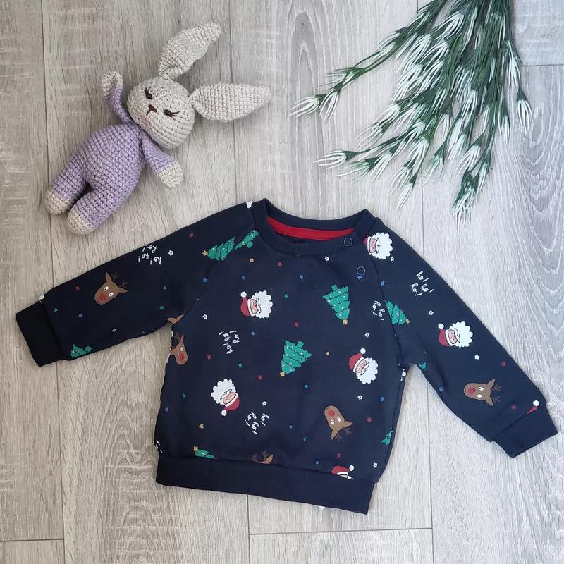 святковий новорічний світшот доя малюків унісекс 6-9 місяців, щріст вказано 74см тканина з невеличким утепленням дуже стильний, зверху для зручності є кнопки стан ідеальний,як нова річ