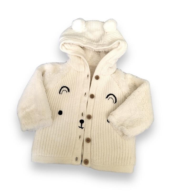 Нова фірмова річ, тепла та зручна з капюшоном кофтинка. Без дефектів. Вʼязана та з підкладом хутро, гарні пуговки. Зріст до 74 точно підійде. На 3-6 міс та на 6-9міс супер, як вказано на етикетці. Кофтинка біла , на першій фото з теплим освіщенням здається як беж.