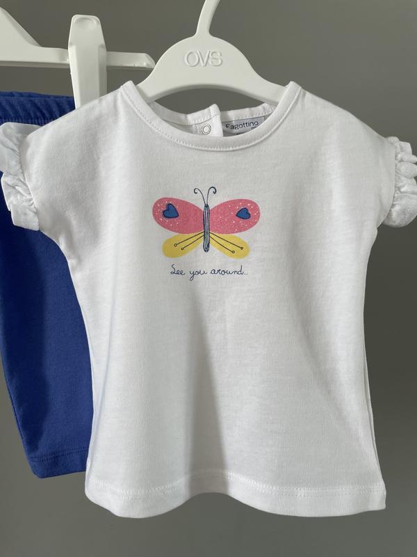 Літній комплект італійського бренду OVS Fagottino Біла футболочка, сині лосинки Склад тканини: 95% бавовна 5% еластан Розмір по бирці : 3-6 місяців 62 см Заміри: Лосінки Довжина по боковому шву - 29 см Довжина по внутрішньому шву (кроковий) - 15,5 см Ширина поясу - 19 см Ширина в нозі 10 см (8 см) Глибина посадки: - задній шов 19,5 см - передній шов 14,5 см Спереду до підгузка - 15,5 Футболочка Довжина по спинці - 28 см Довжина спереду - 25 см Ширина - 23,5 см Окремо ще є лосинки Cool club 62 см