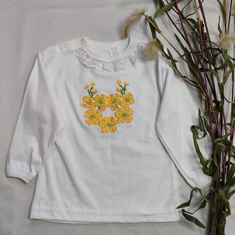 Вишитий лонгслів з мереживом на горловині дитячий ◽Ціна 215 грн ◽ Тканина: трикотаж ◽Колір: білий ◽Розмір: 86 (12-18 місяців)