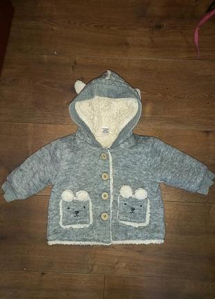 Кофтина,як курточка веселий ведмедик,сірого кольору.Від торгового бренда NEXT. Два кармана,з вушками.Капюшон теж з двома вушками.Тепла кофтина з начесом.На гудзиках,рукава на манжеті. Йде на 3-4 місяця. Розмір: Рукав 19см. довжина 28см. ширина 29 см.