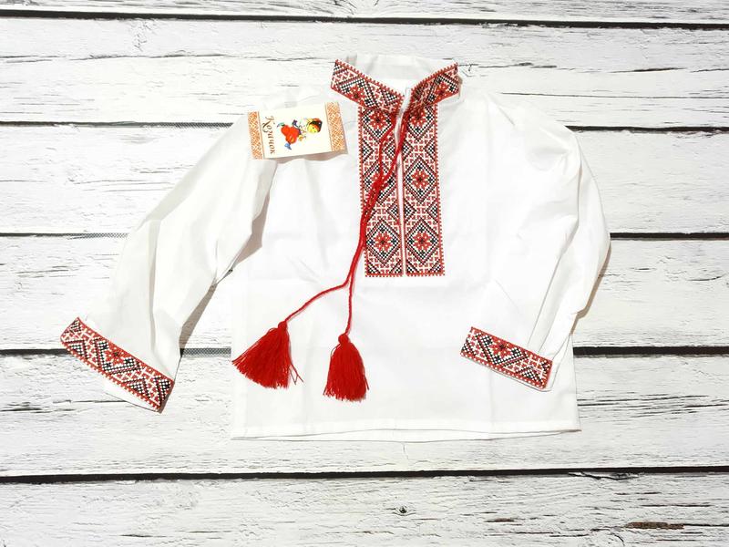 Біла дитяча вишиванка з червоною вишивкою довгим рукавом на хлопчика