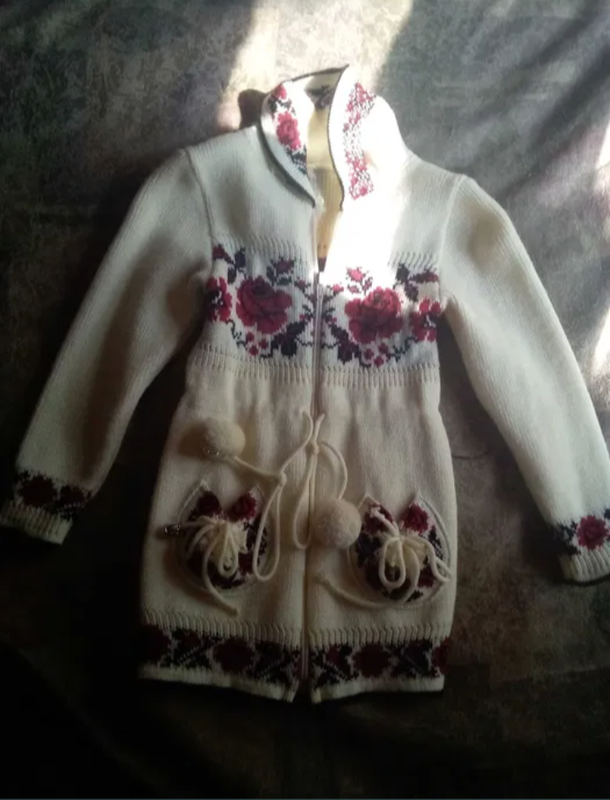 В'язана кофтинка для дівчинки,з гарним орнаментом, замок на блискавці.Можна носити замість куртки.Пояс можна затягувати ,кармани,також затягуються шнурочками. Вік 5-6 років Довжина -50 см. ПО грудей-24 см. Довжина рукава -39 см.