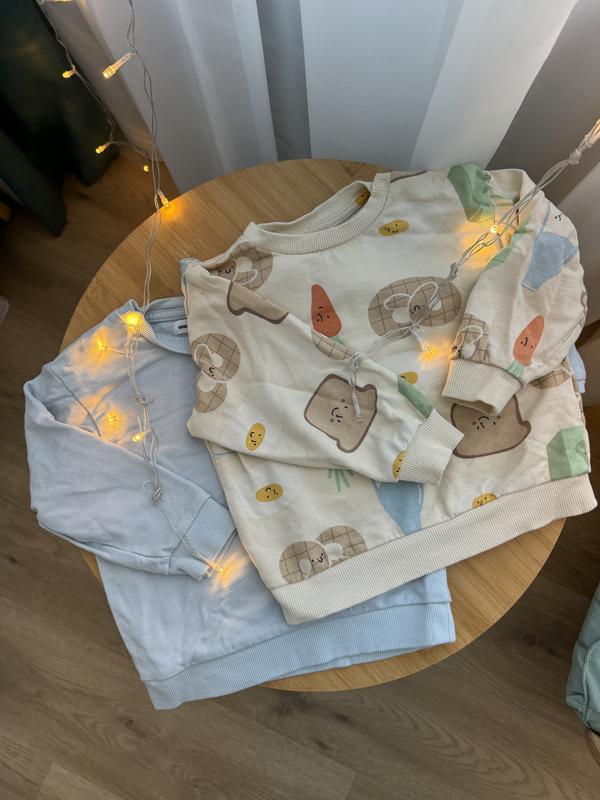 Дуже класні кофтинки у 86 розмірі, повномір. Це сінсей але вони дуже якісні, нема ковтунів після прання і дуже добре носяться. Ідеально підходить для садочку як змінка в осінньо-зимовий період, або вже на теплу весну. 1 - колір ніжно блакитний, 2 - бежевий із милими малюнками продуктів.
