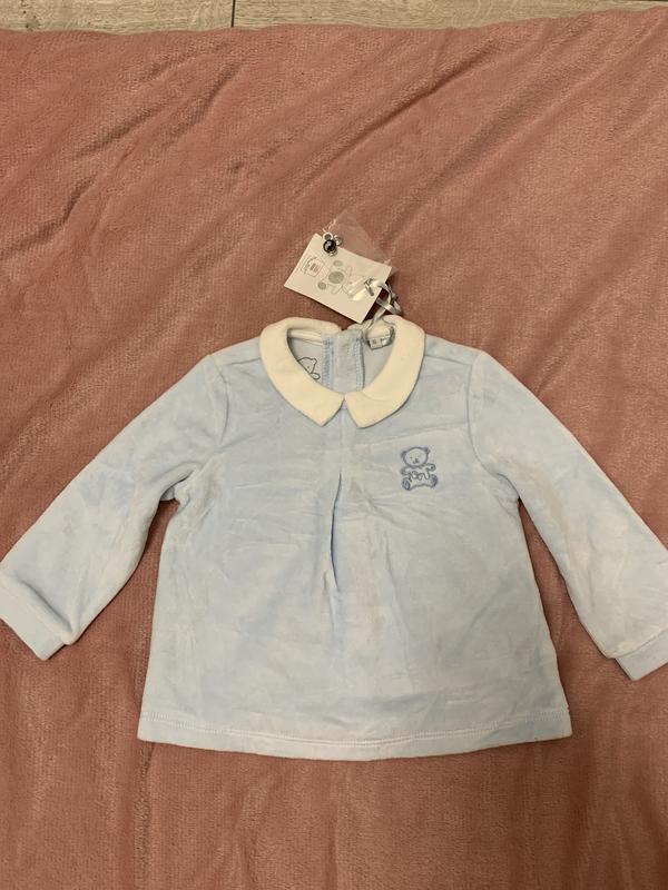 На вік 6 місяців, ніжно голубого кольору, дуже мʼяка і приємна до тіла, застібається на спинці